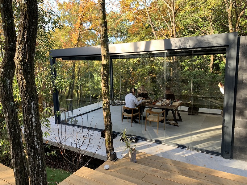 外の景色を楽しめる、外と室内の曖昧な空間。