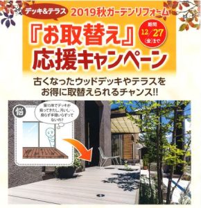 2019/09/16 お取替えキャンペーン☆ 涼しくなってきましたね! 前回の台風でお困りの方が増えてます。 皆様は無事でしたでしょうか。 元気いっぱいな岩室です! 今回は、また帰ってきました、LIXILデッキのお取替えキャンペーンです! 対象商品には ギフトカードがプレゼントされます!! 最大で5万円! チャンスですね!! 現在、工事のお待ち時期が2か月と大変長らくお待ちいただいております。 希望の方はご相談ください! お待ちしております! 記事カテゴリー ガーデン 記事キーワード LIXIL ウッドデッキ ガーデンルーム テラス屋根 外構 商品紹介