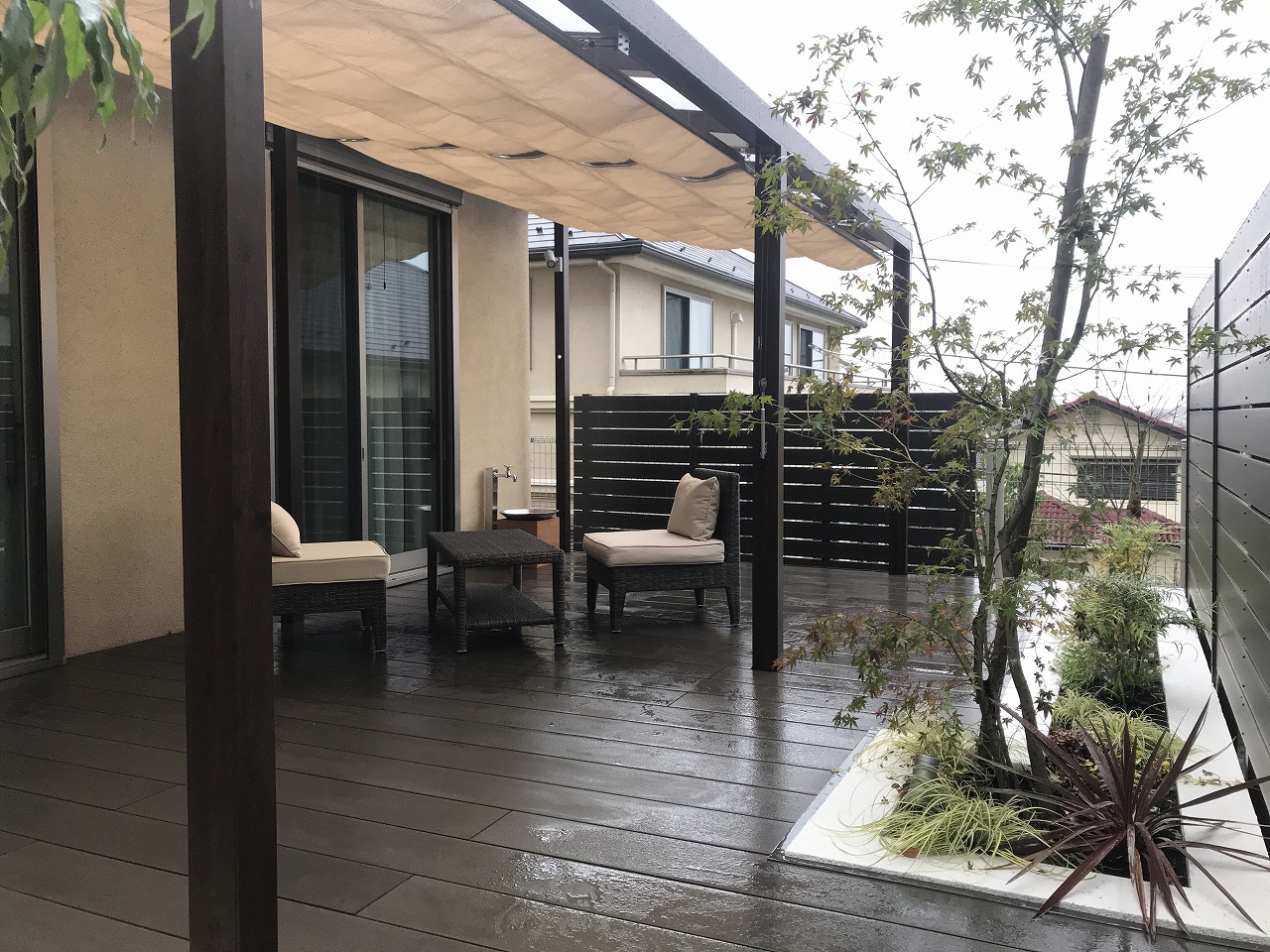 周りはフェンス(マイティウッドフェンス)で囲み、全体的に落ち着いた色に。