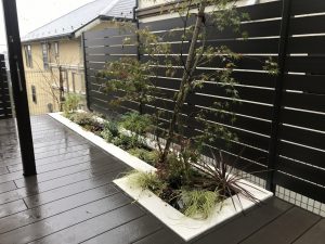 デッキの前は形違いの花壇を設け、掃き出し窓から見える様、