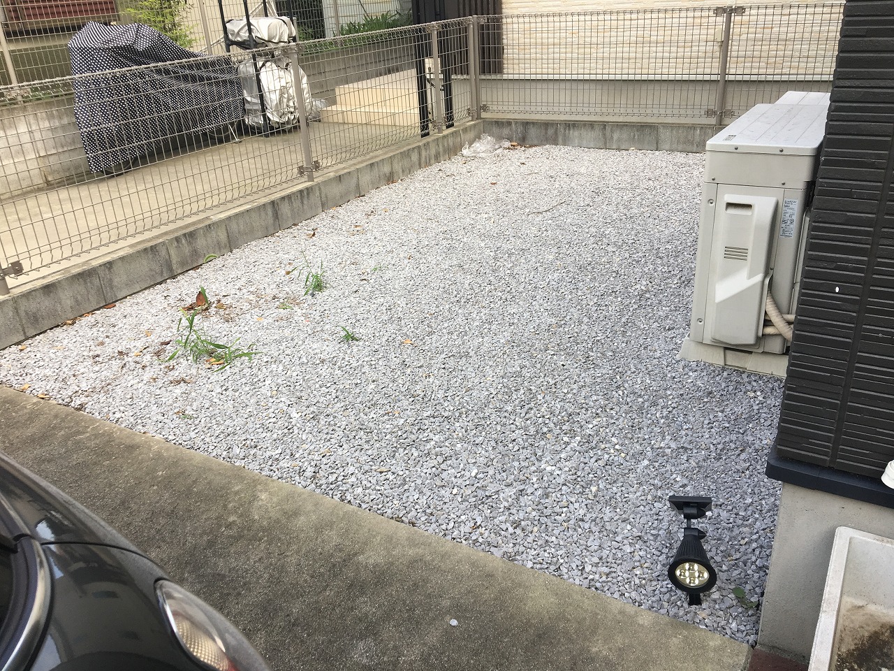 落ち葉の掃除がしやすいように砂利ではなく人工芝を貼っています。