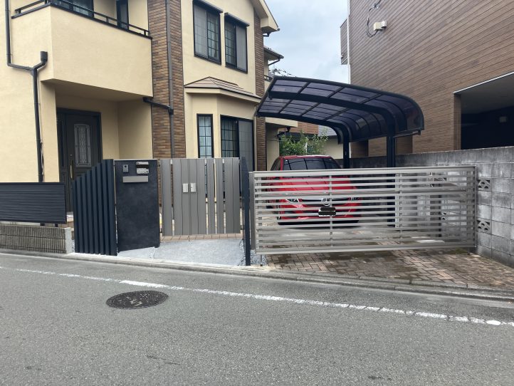 施工前はオーバーゲートではなく、伸縮門扉を開け閉めして出入りされていましたが、毎日使用する中だと使い勝手が悪く、前面道路も交通量が多いため、外出時は開けっ放しになっていました。