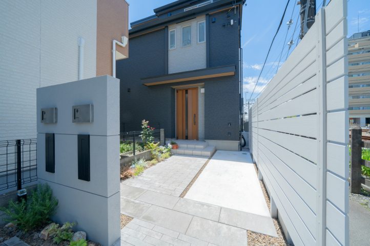 門袖を2枚重ね、しっかりと閉じつつも圧迫感が出にくいようにしています。門周りをしっかりと作ることで、お家の印象がだいぶ変わりますね。落ち着いた色のおかげで、シンプルでおしゃれな外構になりました!